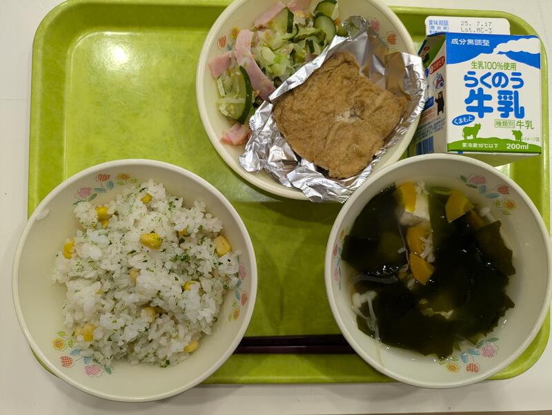 今日の献立は、とうもろこしの炊き込みごはん、肉詰めいなり、ピーナッツ和え、豆腐汁でした。ごはんはとうもろこしたっぷりで季節感あふれる炊き込みごはんでした。