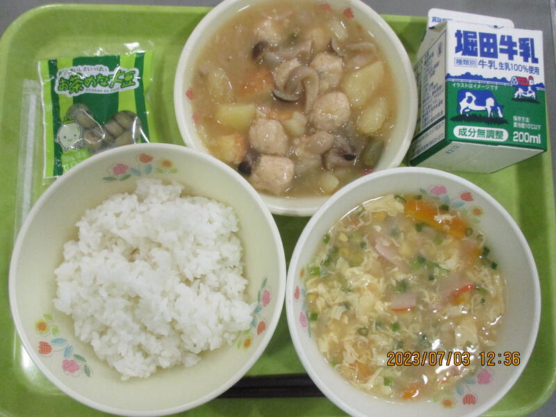 今日は献立は、梅ちりめんご飯、肉じゃが、きゅうりの納豆和えでした。予定では白ご飯でしたが、夏休み中に賞味期限を迎える混ぜご飯の素が在庫でありましたので、急きょ「食材レスキュー」を実施しました。初登場の「きゅうりの納豆和え」はきゅうり、キャベツ、にんじん、挽き割り納豆を塩昆布としょうゆ少々で和えました。1年生の子どもたちもパクパク食べてくれました。ご家庭でも簡単にできますのでお試しください。