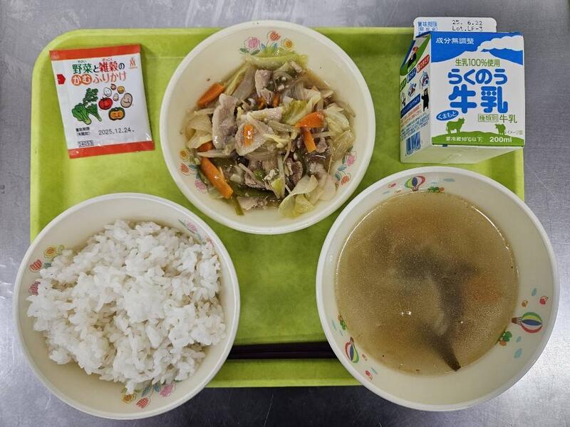 今日の献立は、麦ごはん、かむふりかけ、豚肉生姜焼き、ワカメワンタンスープでした。「かむふりかけ」は、彩りの良い乾燥野菜と食感のよい雑穀を合わせたふりかけです。