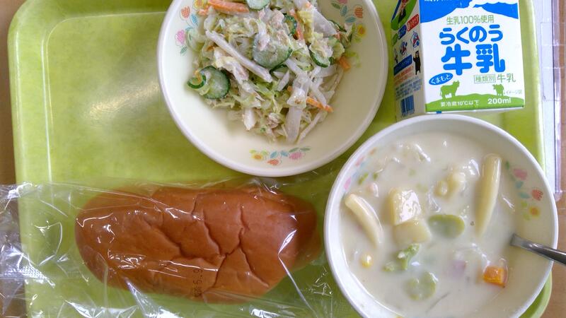 今日の献立は、ミルクパン、空豆クリームシチュー、ごぼうサラダでした。今日のかみかみメニューはごぼうサラダでした。1年生教室では「ひみこのはがいいぜ」でよくかんでたべることの良さをお話しすると、おかわり希望の子どもたちがたくさん手を挙げてくれました。