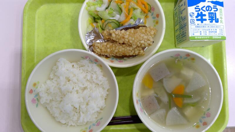 今日の献立は、ごはん、きびなごサクサク揚げ、梅の香サラダ、けんちん汁でした。今日の主菜、きびなごサクサク揚げは、牛深で水揚げされたきびなごをまるごと竜田風味の下味をつけ、サクサクの天玉衣で衣つけしてあり、とてもおいしい一品でした。子どもたちから大好評で、2年生教室ではおかわり希望の子どもたちがたくさんいました。