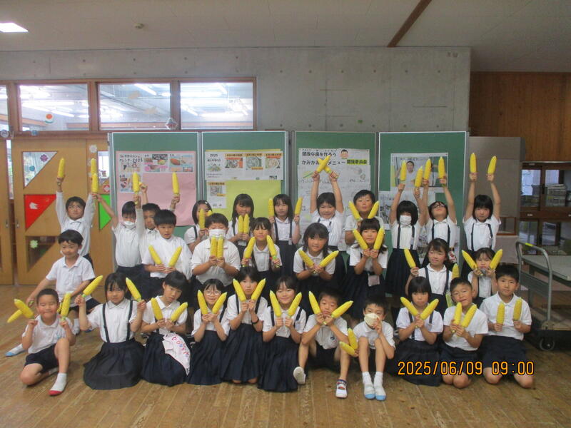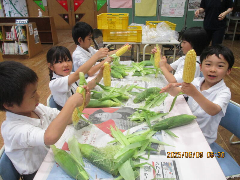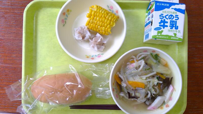 今日の献立は、コッペパン、ちゃんぽん、蒸ししゅうまい、とうもろこしでした。とうもろこしは今泉の後山地区で磯田様が育てられたものです。朝一番に納めていただき、1時間目の生活科の時間に2年生が皮むきをしてくれました。1年生の時よりもとても上手に、早く、ひげ根までていねいに取ることができました。甘くてとてもおいしいとうもろこしでした。