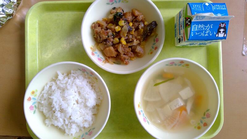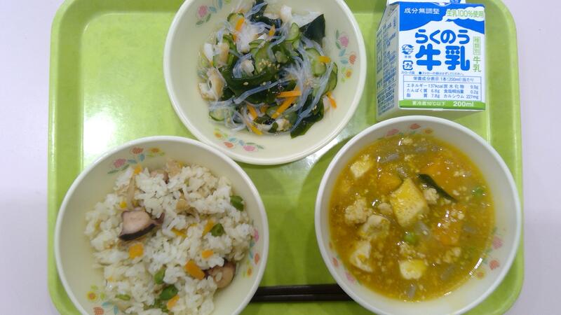 今日の献立は、たこめし、南瓜のそぼろ煮、酢の物でした。今月の郷土料理「たこめし」子どもたちに大人気です。天草でとれたたこを本渡のアマレイさんより納めていただきました。今日はとても蒸し暑い一日でしたので、さっぱりした酢の物が食欲がすすんだようでした。