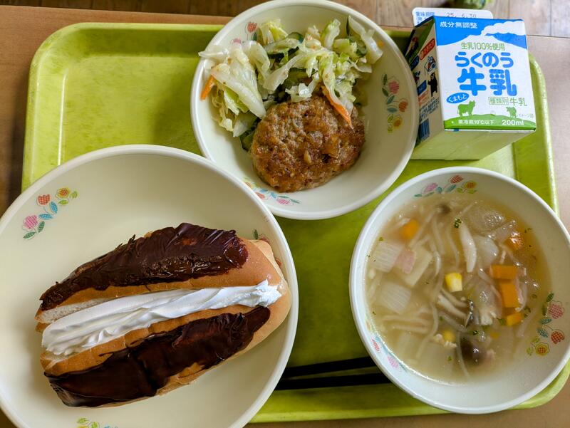 今日の献立は、銀チョコパン、ハンバーグ和風ソース、コールスロー、ポテトスープでした。初登場メニュー銀チョコパンは、縦割りコッペパンにホイップクリームをはさみ、クーベルチュールチョコでコーティングしました。ごぼう入りのハンバーグはかみかみメニューでした。給食手作りのおろし玉葱ソースが良く合いました。