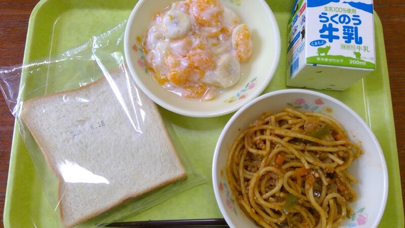 今日の献立は、食パン、鉄のミートソーススパゲティ、フルーツヨーグルトでした。ミートソースには、レバー、蒸した大豆をミキサーにかけ、ひき肉と同じサイズにして混ぜ込み、鉄分を強化しました。また、鉄はビタミンCと一緒にとると、吸収率がアップするのでフルーツヨーグルトと組み合わせました。今日は中1,中2の教室にお邪魔しました。みんな大きく成長していました。