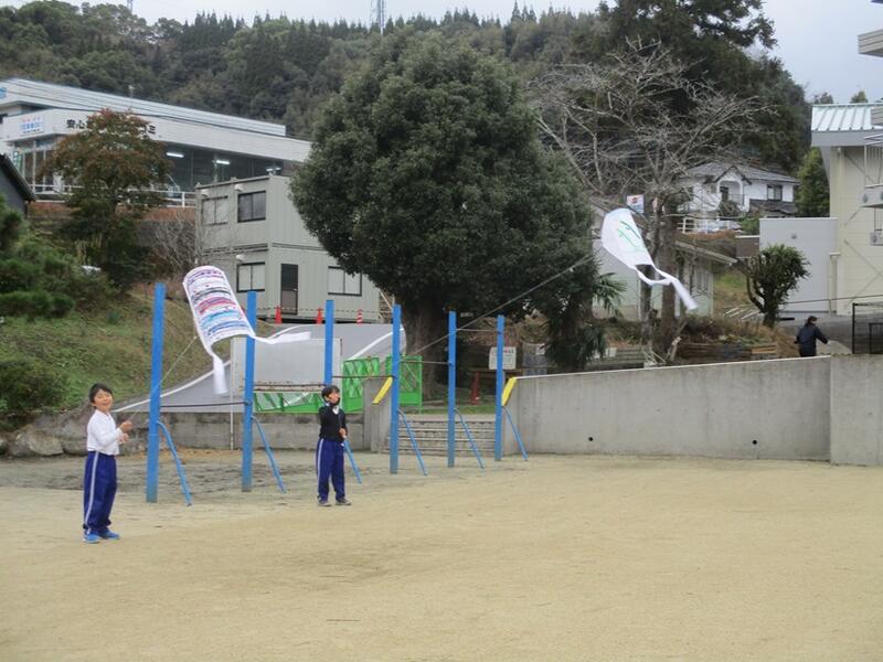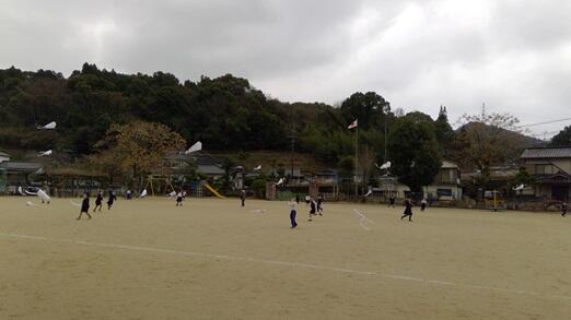 1月22日(月)③ 凧あげ 投稿日時 : 2024/01/22 学校サイト管理者 3時間目の生活科の時間に、1年生が自分たちで作った凧で、凧あげをしました。 先週までと違い風の強い冬空でしたが、風にも負けず、元気に走り回りながら凧あげを楽しんでいました。