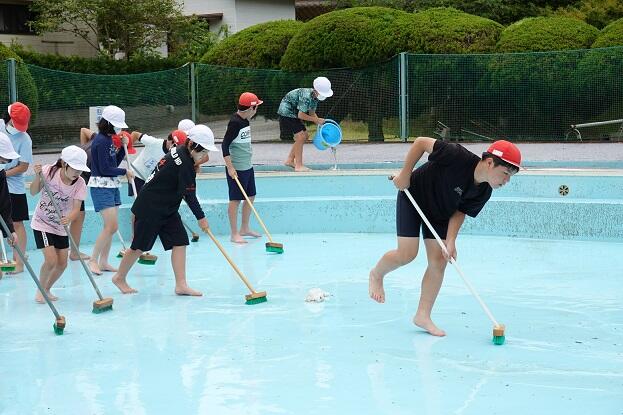 3年生がプールサイドやプールの周りの草取りやゴミ拾い、5年生がプールの中を磨きました。みんなの頑張りで、とてもきれいになりました。