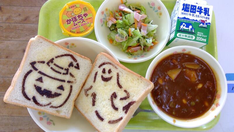 10月31日(火) 投稿日時 : 2023/10/31 学校サイト管理者 今日の献立は、ハロウィントースト、ビーフシチュー、レタスサラダ、かぼちゃムースでした。今日はハロウィンメニューとして、十数種の絵柄が描かれたトーストを出しました。食パンに砂糖を混ぜたマーガリンを塗ってオーブンで焼いた後、イラストの抜き型ラミネートシートを乗せてココアをふり、完成です。子どもたちはとても喜んで、絵柄を見せ合いながら食べてくれました。 Tweet {{options.likeCount}} {{options.likeCount}} {{options.unlikeCount}} {{options.unlikeCount}} 0 コメント