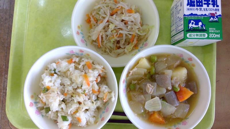 今日の献立は、切り干し大根混ぜご飯、肉じゃが、もやしのごまあえでした。今年になって、牛肉がとても値上がりしたので、肉じゃがも豚肉に替えて作っています。もやしのごま和えはスチームしたキャベツ、もやし、にんじんを薄口しょうゆ、砂糖、ごま油で和えた素朴な味付けですが、子どもたちから「これ大好き!」という声が聞かれました。
