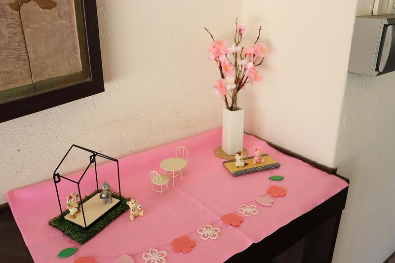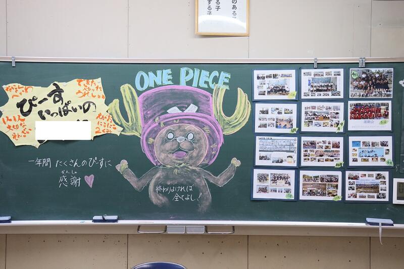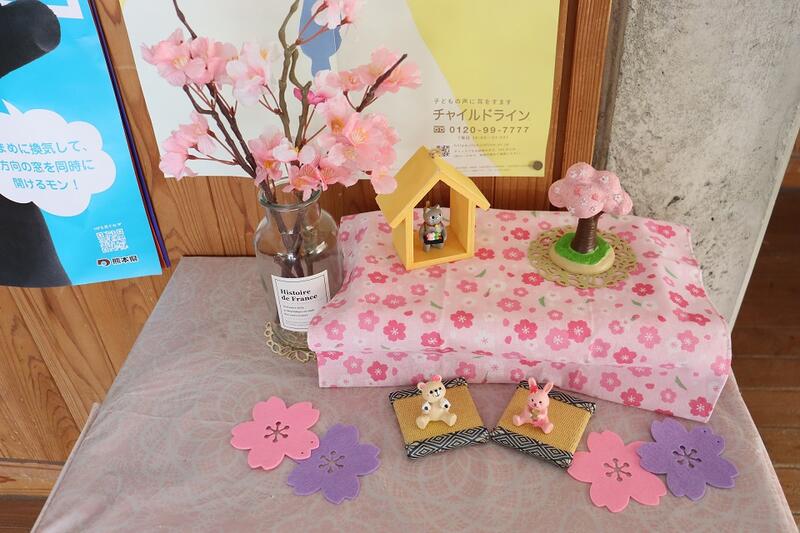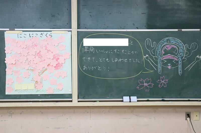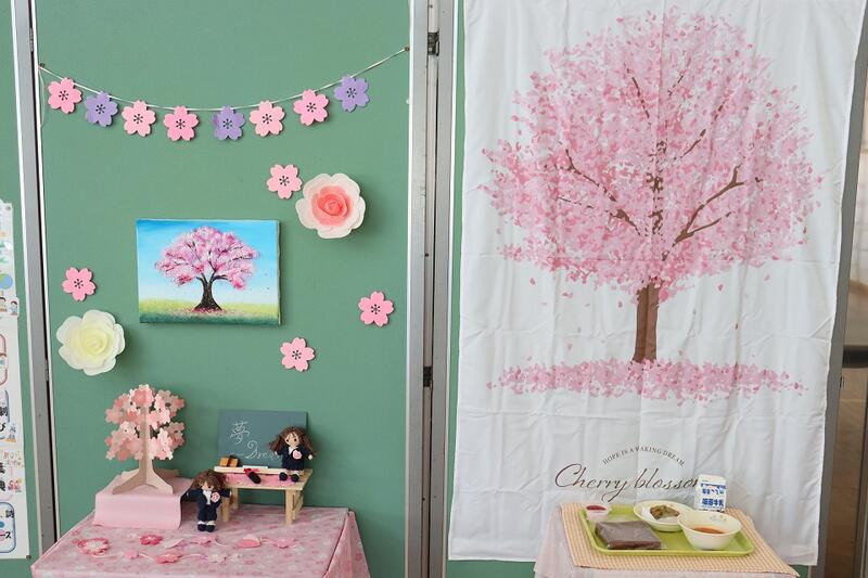 校舎内の展示物が、卒業式が近づき「桜」をテーマにしたものに変更されていました。淡いピンクで、春らしい雰囲気を醸し出しています。