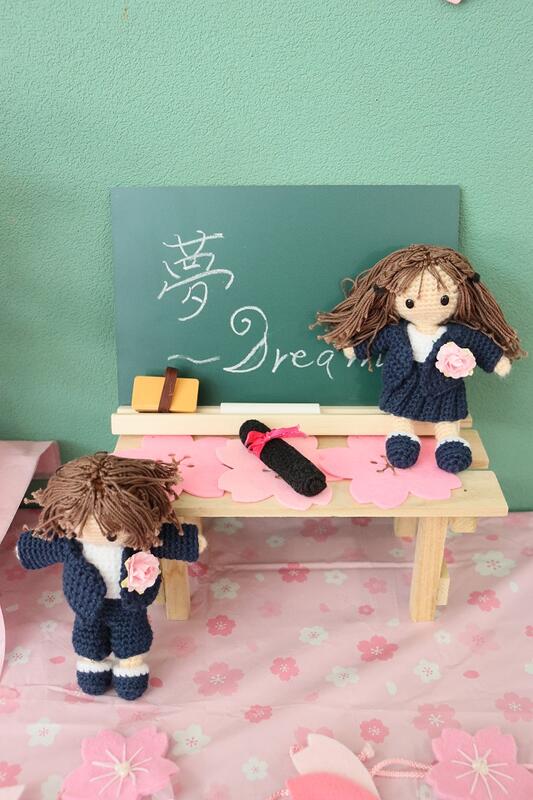 給食室前には、給食調理の桑原先生の編みぐるみ作品が展示されていました。卒業証書の筒も編み物でできています。