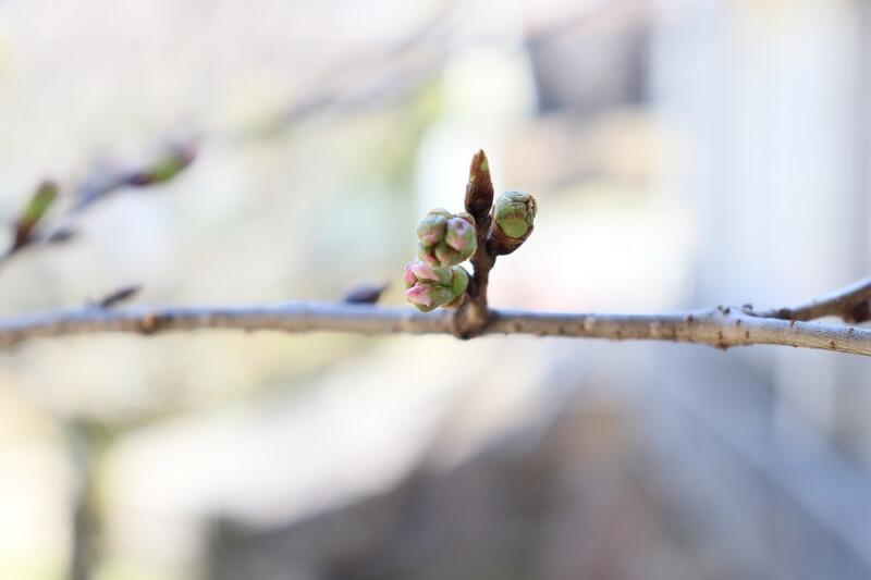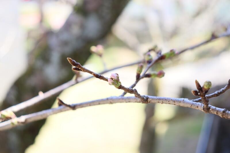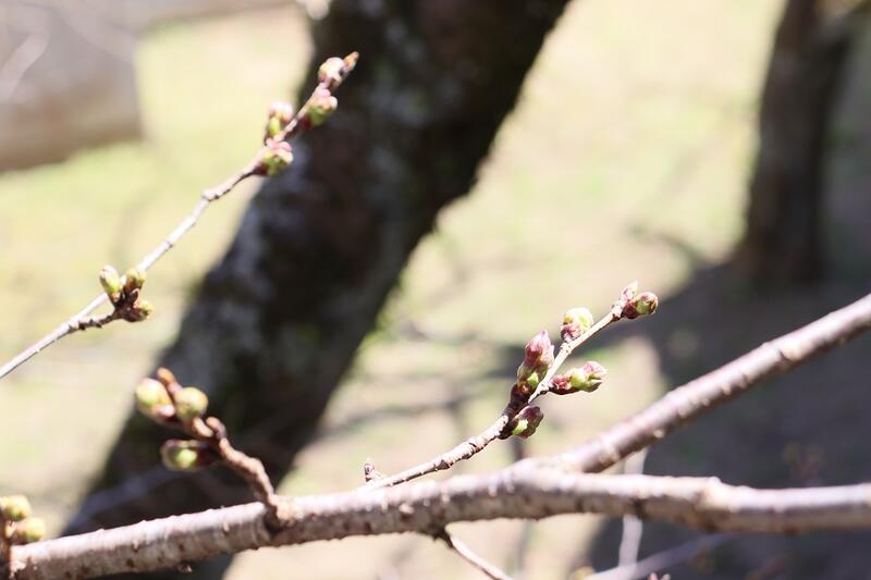 実際の桜はどうかというと、体育館入口の桜は、下の写真のようにつぼみがいつの間にかピンクになっていました。あと数日で開花しそうです。