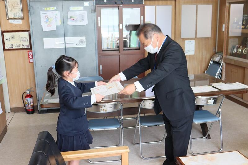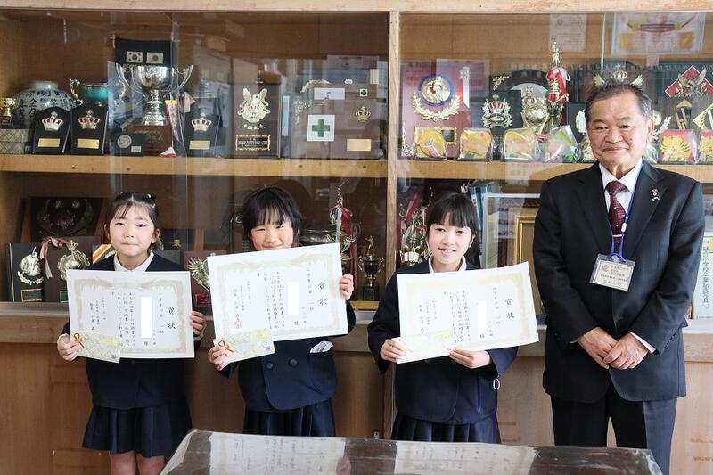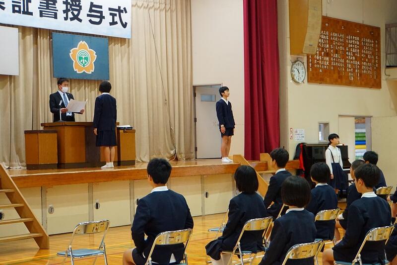 表彰では、3学期に賞状が届いた作文や絵画、俳句など文化面と、天草郡市小体連の長縄チャレンジの3位までの入賞学級を表彰しました。