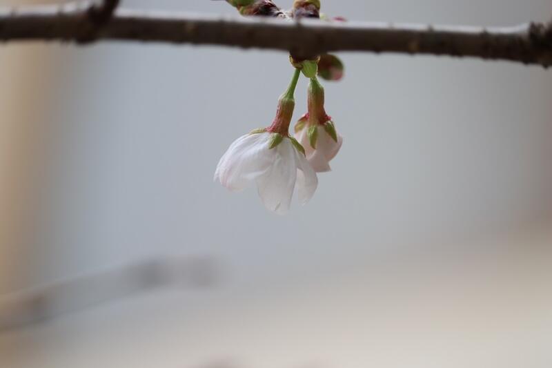 体育館への階段横の桜が、今日の陽気で少し咲き進みました。