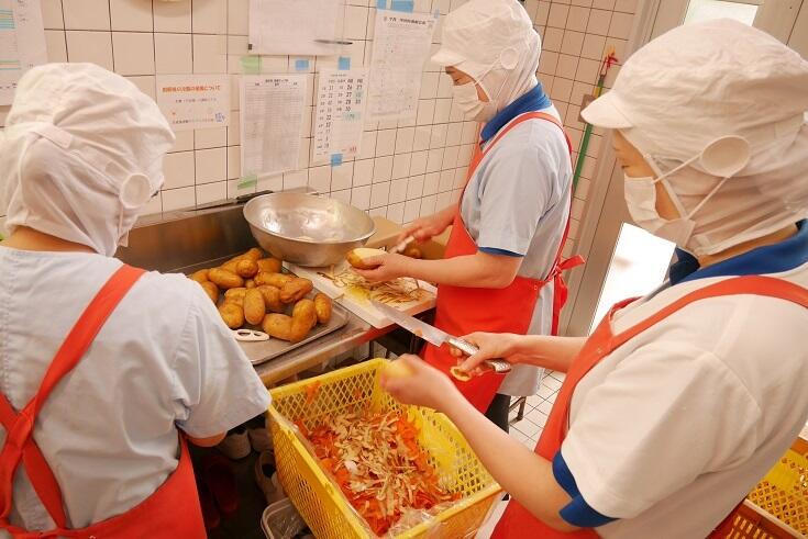 1 まず最初に野菜の皮を剥いたり、食べられない部分を取り除く作業を下処理室で行います。