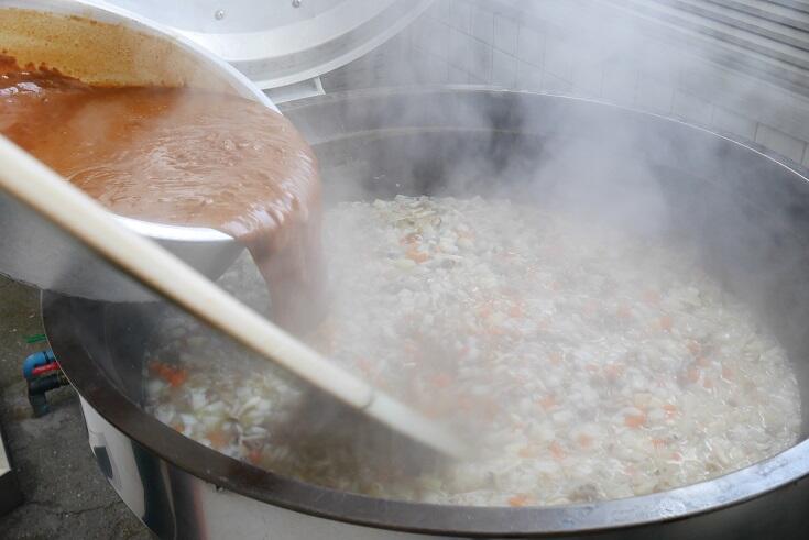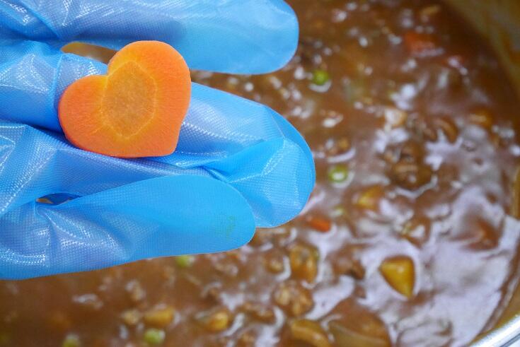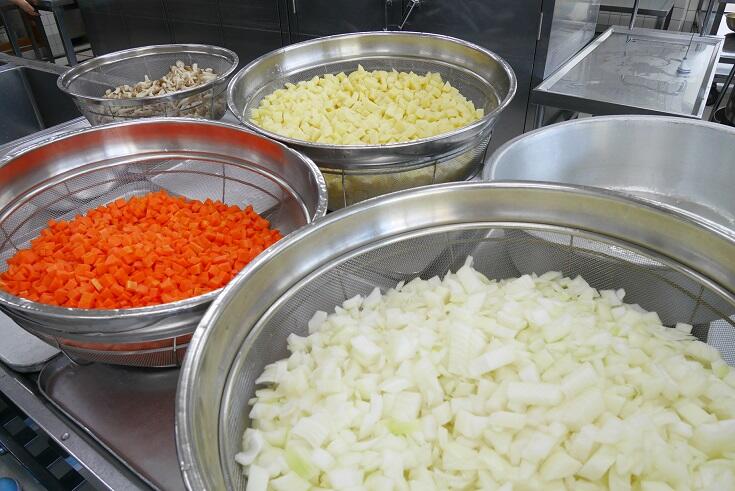 きれいに洗った野菜を調理室に運び食材ごとに切り方を変えてカットします。ハヤシライスは、たっぷりのニンニクと赤ワインで牛肉を炒めていきます。最後にグリーンピースを入れ完成です。