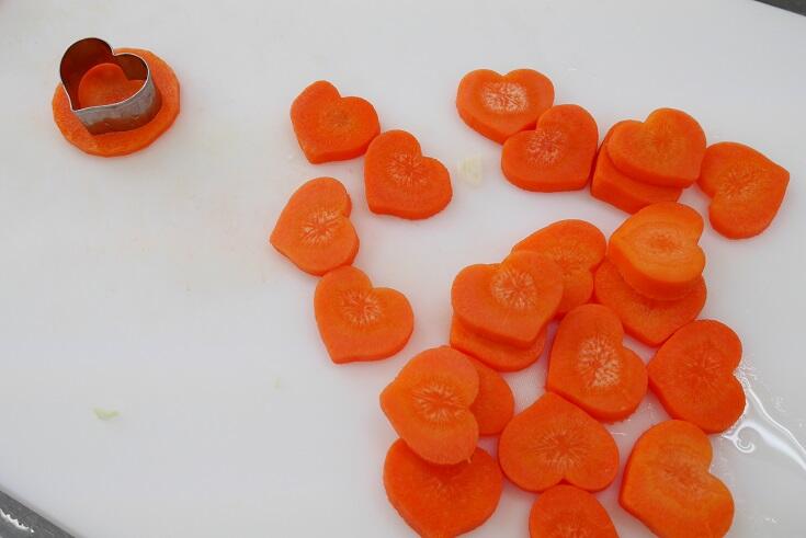『ハッピー人参の日』とは、大きなおかず(汁物)に各クラス1個型抜きをした人参を入れるという企画です。健康委員会の子どもたちと計画をして取り組んできました。ハートに型抜きされた人参が入っていた人は、委員会から「ハッピーカード」が配られます♪