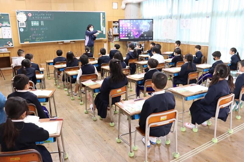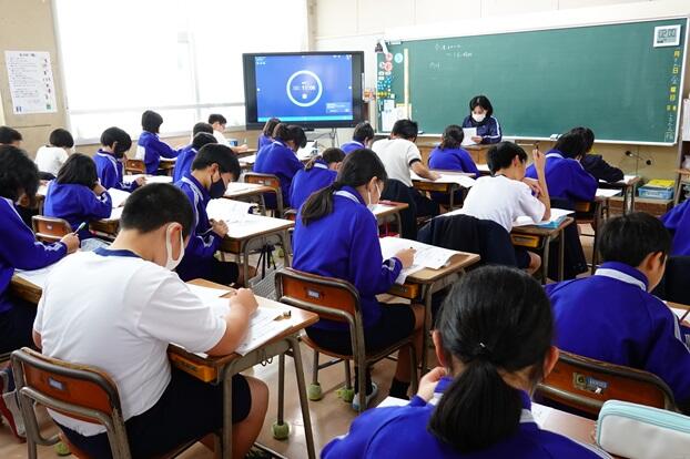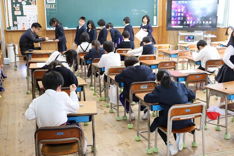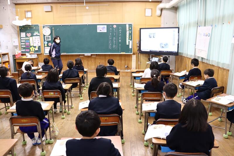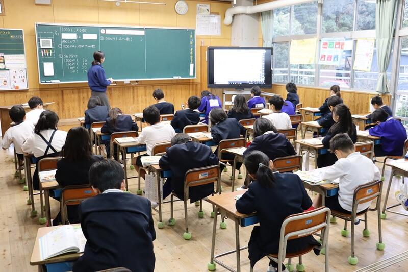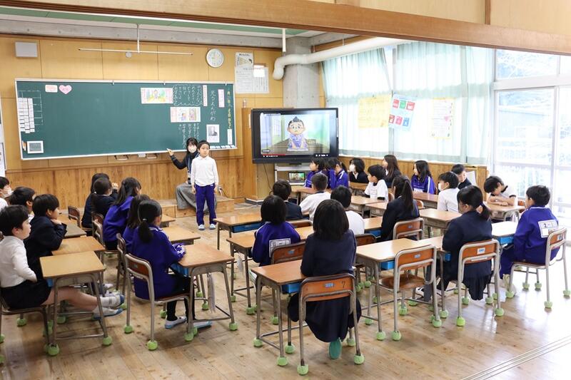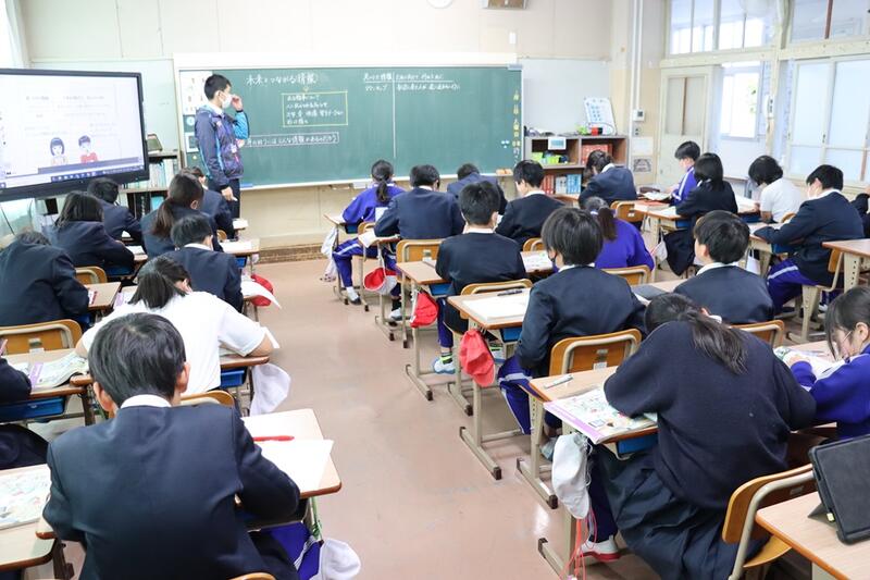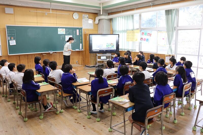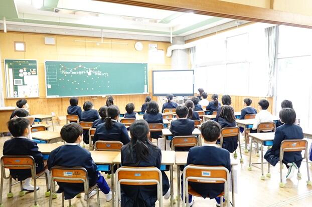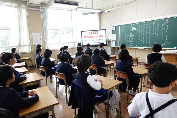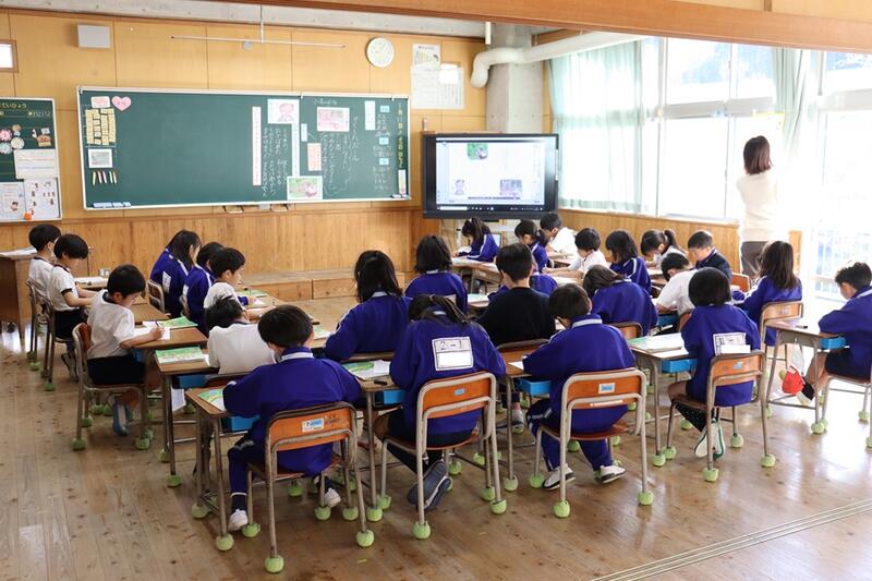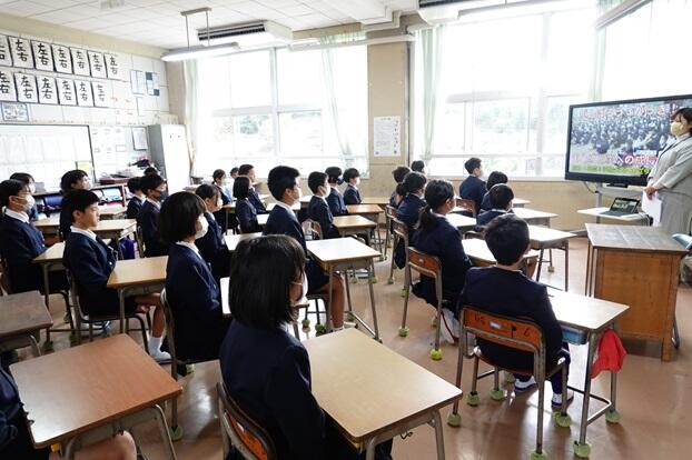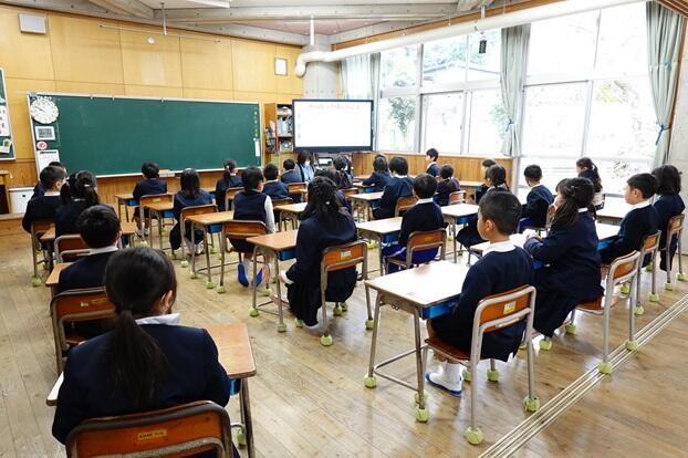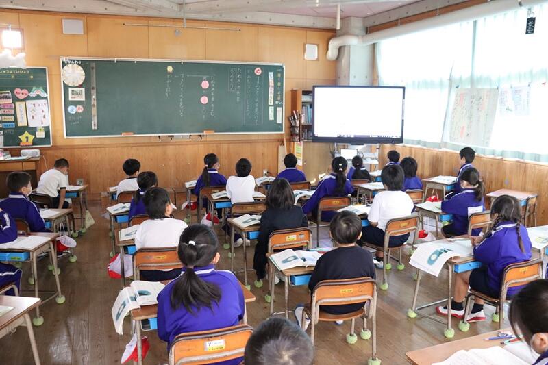 子どもたちは、各教室で電子黒板をしっかりと見つめながら集中して聞くことができていました。