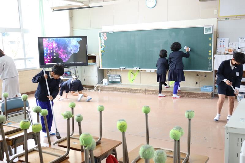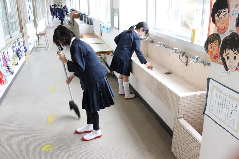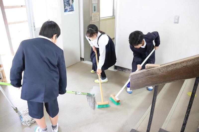 雨天なので、今日はボランティア活動は無しかなと思っていたら、6年生の3人が1階の廊下の掃き掃除をしてくれていました。