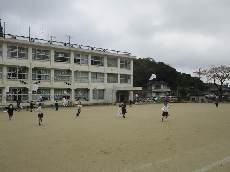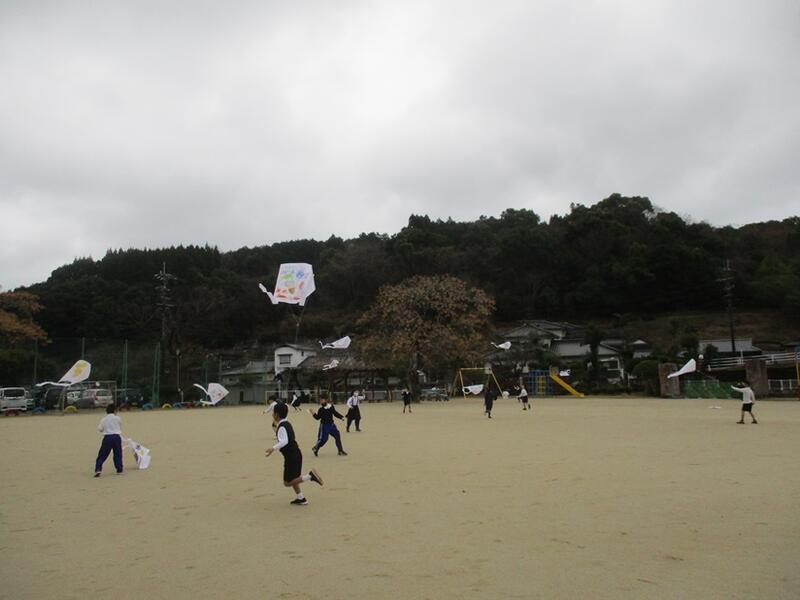 3時間目の生活科の時間に、1年生が自分たちで作った凧で、凧あげをしました。