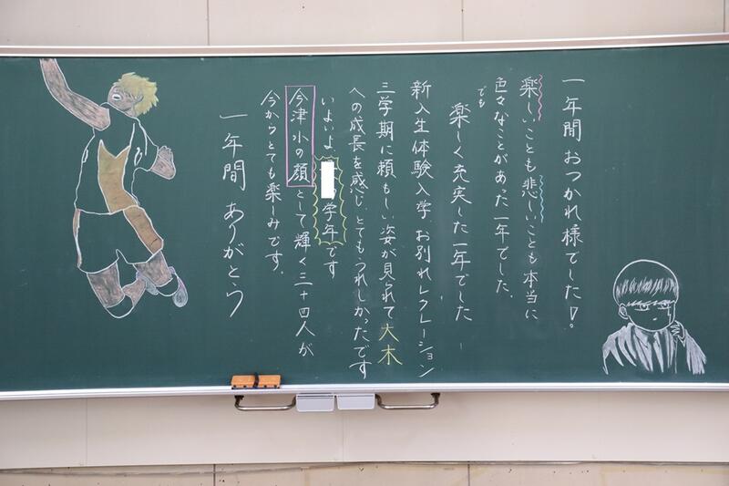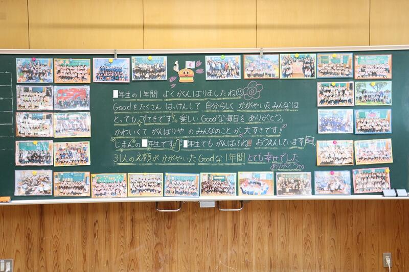 今朝、各学級で登校してくる子どもたちを待っていたのは、担任の先生方から子どもたちに向けたメッセージ板書でした。この1年間に対する思いが込もった板書です。