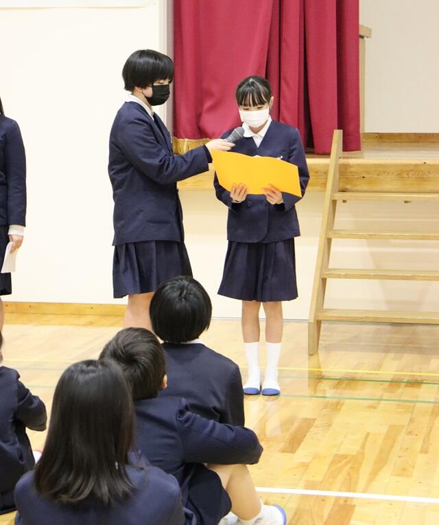はじめに、各学級代表が、「本年度頑張ったことと来年度頑張ること」の発表を行いました。それぞれがこの1年間頑張った思いがとても伝わる、すばらしい発表でした。