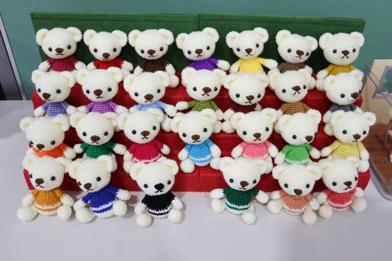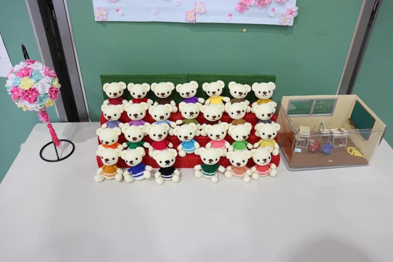 給食室横の展示場所に、下の写真のようにとてもかわいい「編みぐるみ」が展示されています。