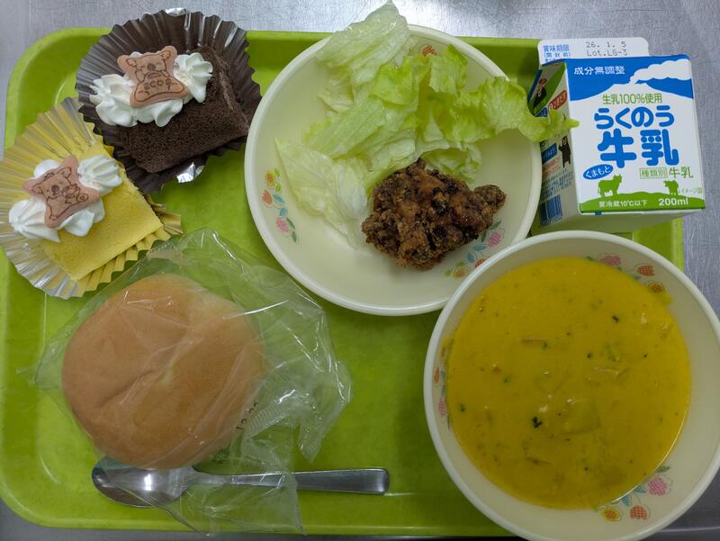 今日の献立は、丸パン、タンドリーチキン、レタス、かぼちゃスープ、クリスマスケーキでした。今年のクリスマスケーキはロールケーキ(バニラとチョコ)のセレクトでした。いちごをトッピングする予定でしたが、とても高価だったので断念し、いちご風味のお菓子をトッピングしました。子どもたちは「かわいい