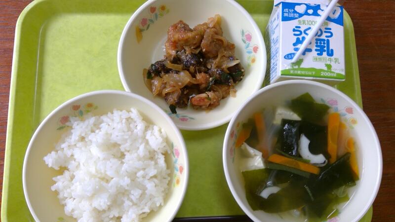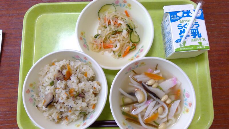 今日の献立は、たこめし、ばんかんぽん酢和え、大豆うどん汁でした。今日は郷土料理の日でした。たこめしは1年生の子どもたちは、最初は少なめに配膳してもらい、食べてみたら「おいしい!」とぞおうりょうし子子どもたちがたくさんいたそうです。今日で上天草地場産物週間最終日でしたので、健康委員会で作成したふり返りと地場産物クイズの動画を楽しんでもらいました。