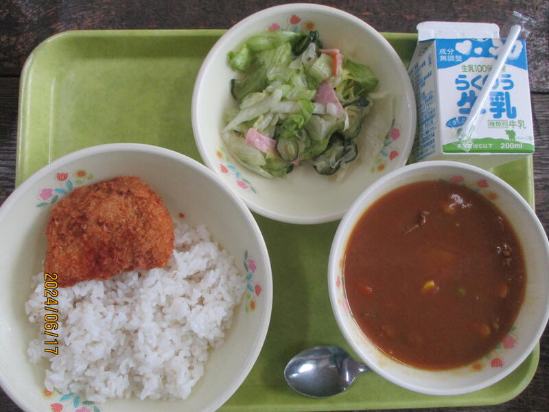 今日の献立は、カツカレー、野菜サラダでした。l今週は週末に行われる中学生の部活動の集大成、中体連の応援食となっています。今日のテーマは「げんかつぎ」、勝つカレーでぜひ勝利を手にしてほしいですね!