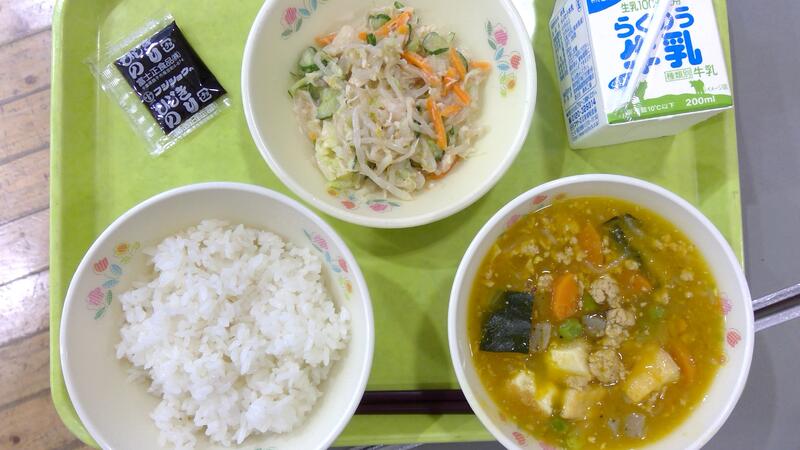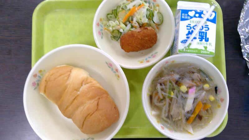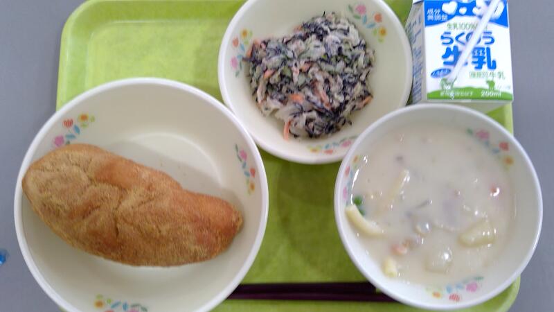 今日の献立は、あげパン、クラムチャウダー、ひじきマヨサラダでした。今日はすべての献立に、貧血予防の鉄分が含まれる食材が入っています。パン→きなこ、スープ→あさり、サラダ→ひじき、です。鉄分をしっかり取って、疲れ知らずの体を作ってほしいですね!
