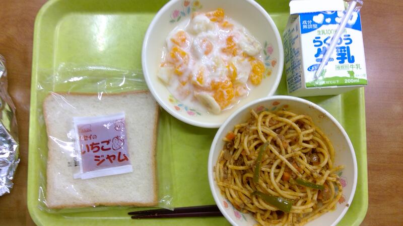 今日の献立は、食パン、いちごジャム、鉄のミートソース、フルーツヨーグルトでした。ミートソースには、牛、豚の挽肉にレバーの竜田揚げをミキサーで挽肉状にくだいたものも加え、鉄分をアップさせました。