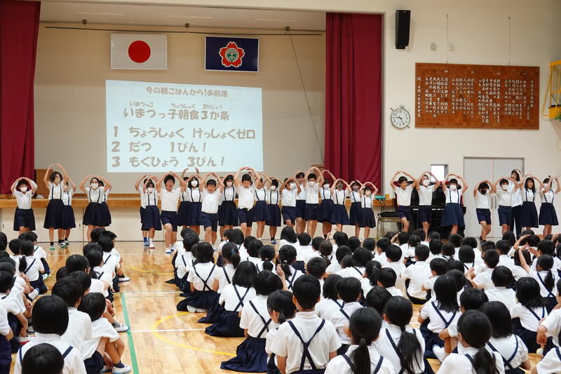 今日は6年生の家庭科の学習成果発表として「朝ごはん集会」を実施しました。①朝ごはんの役割について説明、②お家で作った炒め料理紹介、③朝食アンケート結果発表、④朝ごはんクイズ、⑤全校児童で今津っ子朝食の歌、と6年生の頑張りのおかげで楽しい会となりました。