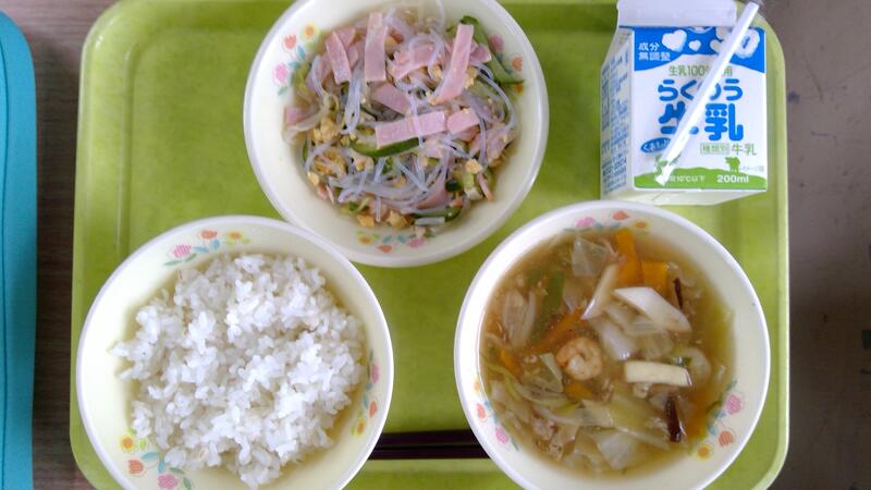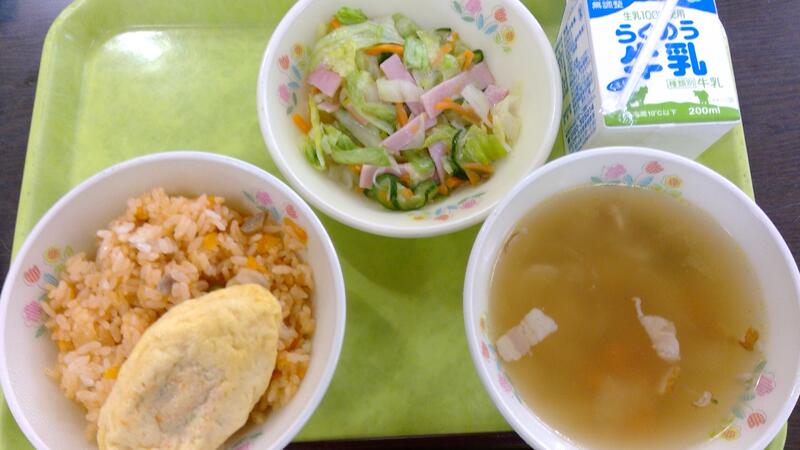 今日の献立はオムライス、レタスサラダ、コンソメスープでした。6月の初めに放送委員会の企画で1年生インタビューがあり、「好きな食べ物はなんですか?」の質問に「オムライス」と答えた人がたくさんいました。今日の給食を楽しみにしていた1年生ですが、想像していたオムライスとは異なり「ちがう」と残念がっていたお友だちも数名いたようです(^0^;)
