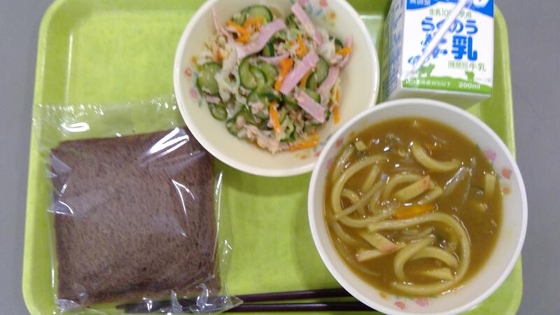27日(木)の献立は、ココアパン、カレーうどん、ツナサラダでした。プール帰りの子どもたちが展示食をのぞき込んで「やったー」と歓声を上げていました。