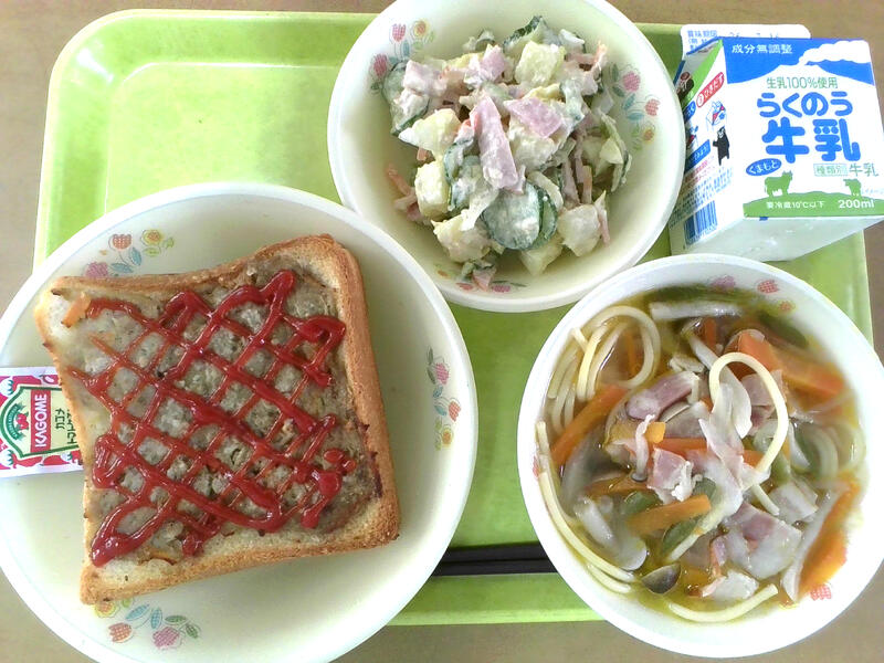 今日の献立は、バーガートースト、スープパスタ、ポテトサラダでした。バーガートーストは、ハンバーグのたねを食パンに薄く塗り伸ばし、オーブンで焼きました。3年教室ではパンのおかわりのじゃんけん大会が白熱しました。