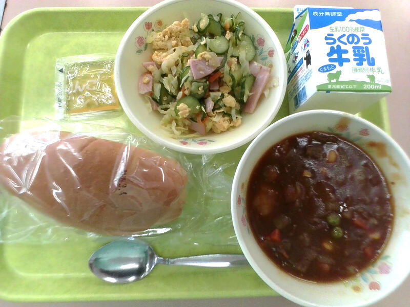 今日の献立は、コッペパン、りんごジャム、ビーフシチュー、たまごサラダでした。ビーフシチューは2種類のルーを混ぜて使っています。