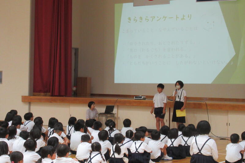 そして、今日は人権集会を開きました。企画委員会の子どもたちを中心に、今津っ子宣言やなかよしの木の取組をみんなで確認しました。「友だちの良いところをたくさん見つけたいです。」「いじめは絶対にしてはいけないと思います。」などと感想の交流もありました。