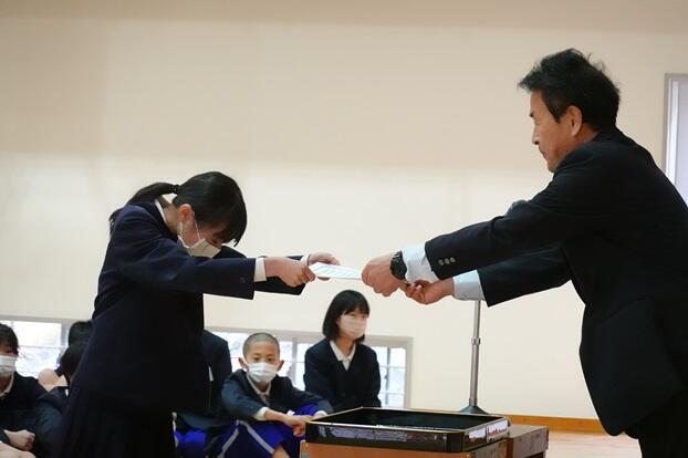 ノートの達人、天草郡市小体連長縄チャレンジ、絵画関係のそれぞれ代表者に表彰を行いました。