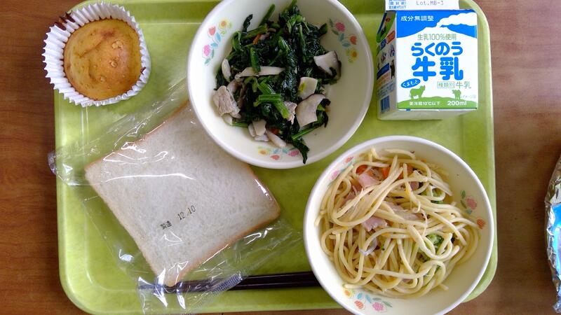 今日の献立は、食パン、ちりめんパスタ、ほうれん草サラダ、カステラ風ケーキでした。いよいよ明日は持久走大会本番です。ほうれん草で鉄分、パン、パスタ、カステラは明日のエネルギー源です。みんなが良い走りをできることを願っています!