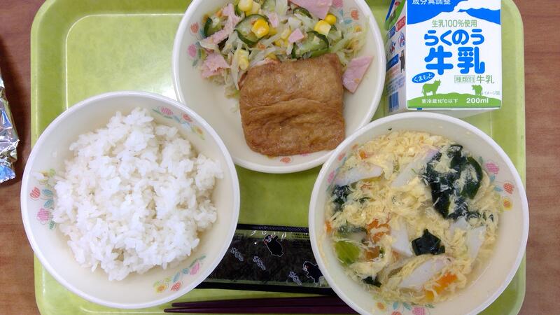 今日の献立は、ごはん、肉詰めいなり、ピーナッツ和え、かき玉汁、味のりでした。1年生は、味付けのりを手を使わずにおはしでのり巻き作りにチャレンジしました。