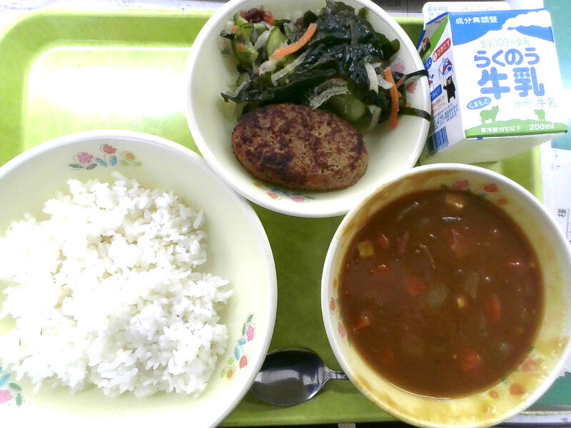 今日の献立は、ハンバーグカレー、海藻サラダでした。海藻サラダの海藻は、わかめ、茎わかめ、赤かえでのり、の3種がミックスされています。