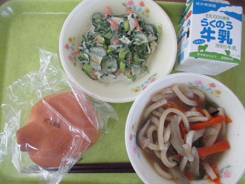 今日の献立は、ひのくにパン、肉ごぼううどん、和風サラダでした。熊本県の学校給食用のパンの材料の小麦粉は熊本県産と北海道産が6:4の割合で配合して作られています。今日のひのくにパンは熊本県産小麦粉100%で作られているのが特徴です。