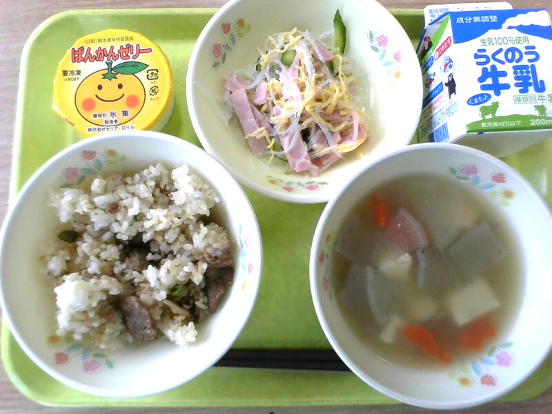 今日の献立は、牛じゃこごはん、バンサンスー、けんちん汁、晩柑ゼリーでした。牛じゃこごはんは牛肉、ちりめん、生姜、いんげんを炒めて甘辛く味付けし、ごはんに混ぜました。ばんかんゼリーは食材レスキューです。5月に賞味期限を迎えるものでした。