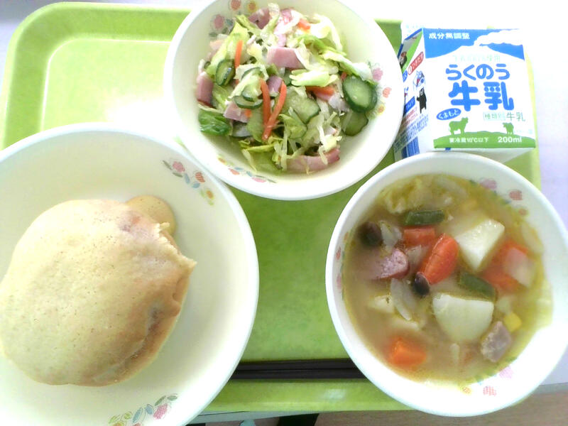 今日の献立は、手作りメロンパン、コーンチャウダー、ツナサラダでした。みんなが楽しみにしていた手作りメロンパン。朝一番にビスケット生地を作り、冷蔵庫でしばらくねかせ、パン生地と合体→発酵→焼いて、外はさくさく中はふわふわに仕上がりました。6-1では白熱したおかわりじゃんけんが繰り広げられました。