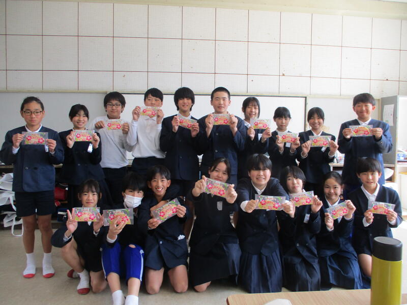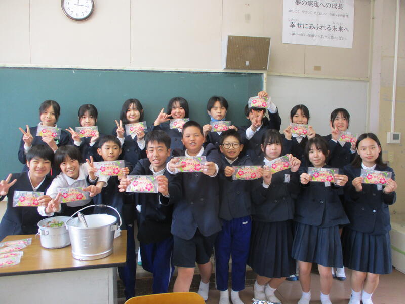 9日(月)の献立は、赤飯、鯛の天玉揚げ、菜の花和え、紅白汁でした。今日明日は中3のみなさんの卒業を祝う給食です。赤飯は苦手な子どもたちが多いようですが、お祝いに欠かせない日本の大切な食文化メニューです。1年生は赤飯が苦手な人も「お祝いのごはんだから頑張って食べる!」とチャレンジしてくれました。祝い事の魚、鯛の天玉揚げは、子どもたちに人気の天玉揚げシリーズの第二弾です。そして、汁には紅白のお餅が入っていました。