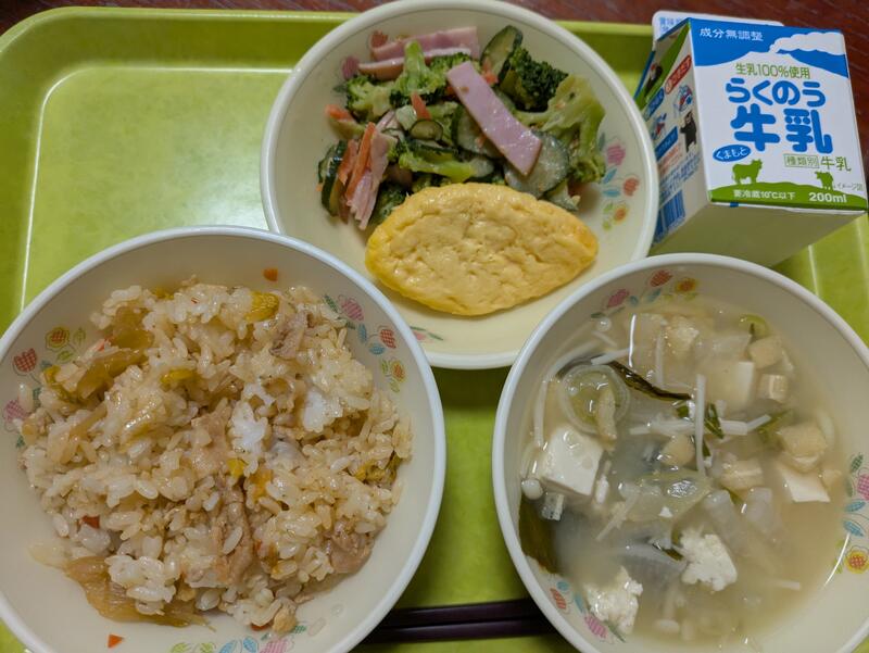 今日の献立は、麦ごはん、鶏の唐揚げ、コールスロー、みそ汁でした。鶏の唐揚げを楽しみにしていた今津っ子がたくさんいたようでした。