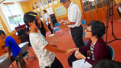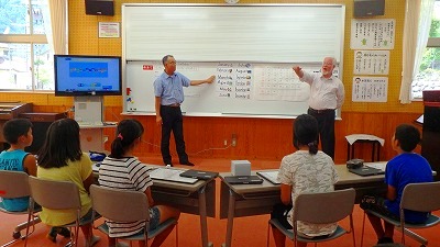 中学校の先生方は、パウエル先生と英語で流暢に会話している5人の英語力に
