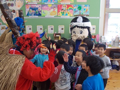 校内に赤鬼と青鬼が現れ、みんなで豆まきをしました。