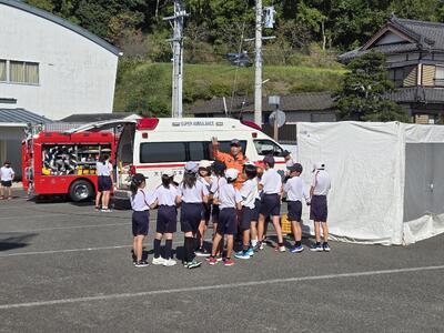 天草広域連合中央消防署五和分署の皆さんが、昼休みにスクールバス駐車場で「ミニ消防フェア」を行ってくださいました。火災予防週間の取組のひとつとして行われたもので、子供たちは消防車や救急車の見学、水消化器や煙体験などを経験しました。五和分署の皆さん、ありがとうございました。